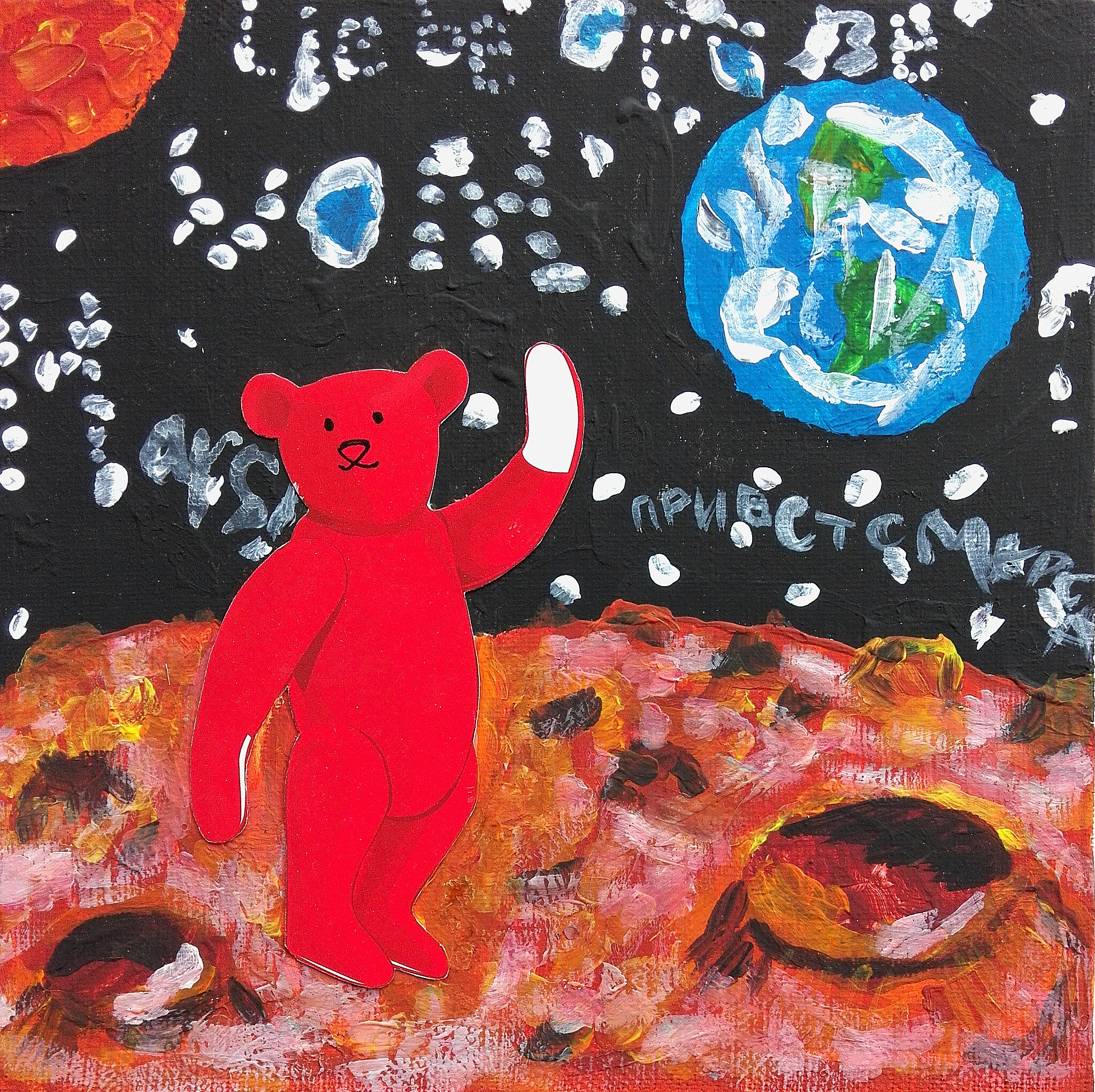 Мой Мишка живет на Марсе и его зовут Красён Мишкин. Он темно-багрового цвета, но из-за освещения и почвы на Марсе, он выглядит ярко-красным…