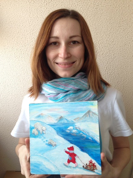 В детстве мне всегда было жалко белых медвежат на Северном полюсе. Мне казалось, что им там холодно и совсем нечего есть: ни ягод-ни меда, а один снег кругом. Красный мишка - любитель путешествий и незабываемых приключений. И, само собой, он не оставит своих друзей без подарков и внимания. Несмотря на долгое путешествие, картина сохранит его историю. А история о том, что любой уголок нашей планеты - прекрасен! Где бы ты ни был, не забывай своих друзей и не сожалей о том, где тебя нет. Возможно, эта история часть меня самой? Моей мечты? И медвежатам, все же, перепадет сладенького…